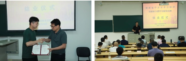在结业仪式庆典上,中共宁乡市委统战部副部长、工商联党组书记李杰给学员颁发结业证书,湖南星邦智能装备股份有限公司董事长刘国良作为学员代表发言。